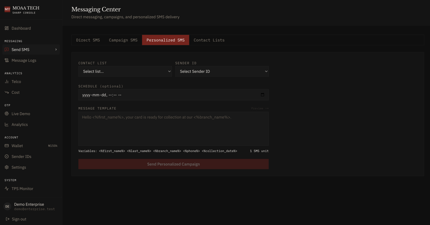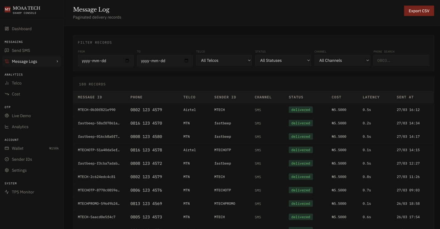 Real-time delivery tracking, cost analytics, provider performance metrics, and message logs.